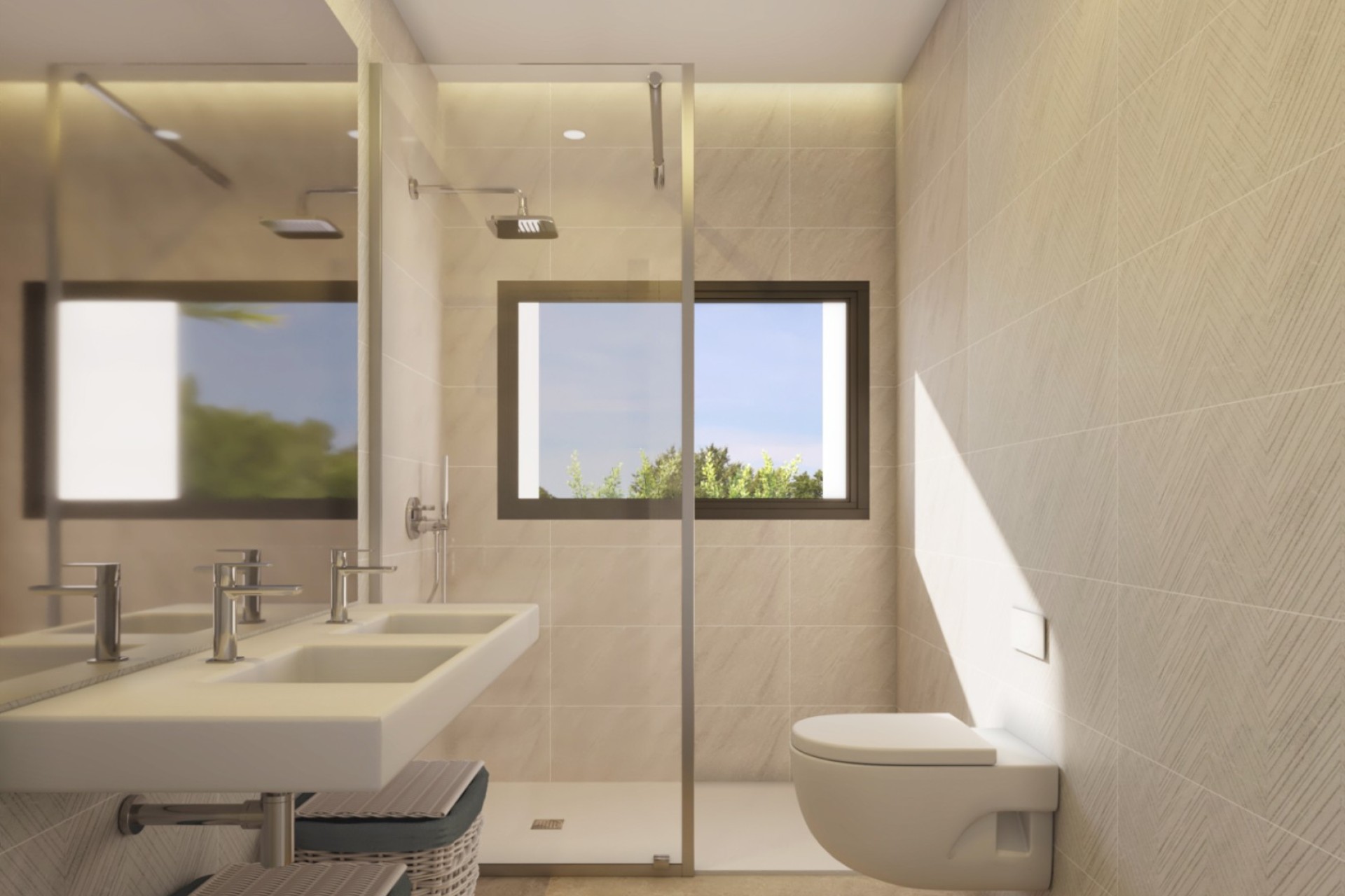 Distribution and spaces of the villaThe villa has four double bedrooms, three full bathrooms and a guest toilet, as well as an office or library, a spacious living-dining room with an open-plan kitchen, laundry room, pantry, storage room and garage with a machine room.